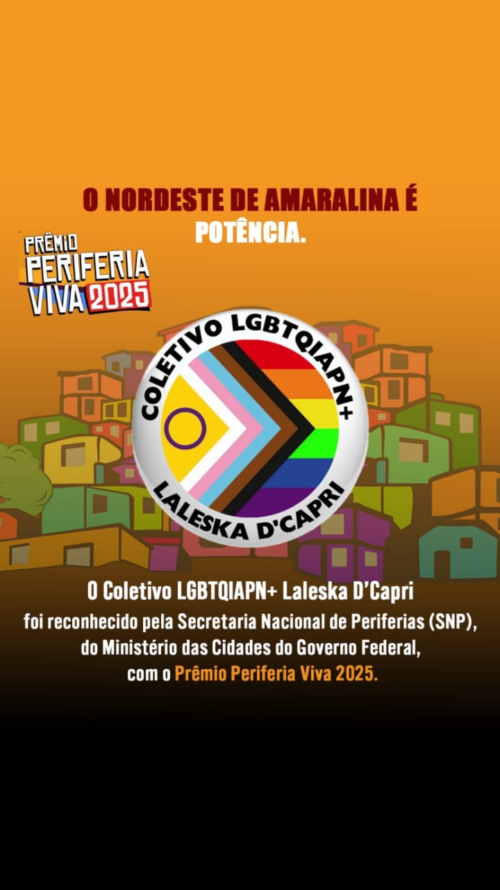 A iniciativa “Ação de Prevenção às Violências no Complexo do Nordeste de Amaralina”, desenvolvida pelo Coletivo LGBTQIAPN+ Laleska d’Capri, foi selecionada como finalista do Prêmio Periferia Viva 2025, promovido pela Plataforma Nós Periféricos, do Governo Federal. O projeto está entre mais de 2.500 iniciativas inscritas em todo o país.