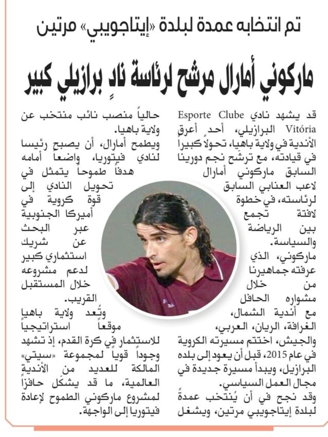 A disputa pela presidência do Esporte Clube Vitória ultrapassou as fronteiras do Brasil e ganhou repercussão no Oriente Médio. Nesta quinta-feira (11), o tradicional jornal Al-Watan, do Qatar, publicou uma matéria destacando a possibilidade de Marcone Amaral, ex-zagueiro da Seleção do país, assumir o comando do clube baiano.