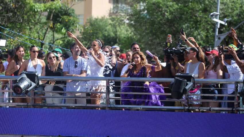 O momento mais alto do desfile veio logo em seguida, quando Ivete Sangalo convidou Daniela Mercury para subir ao trio e cantar com ela, deixando clara a admiração que sente pela artista: “deixa eu chamar a Rainha do Axé para cantar comigo”.