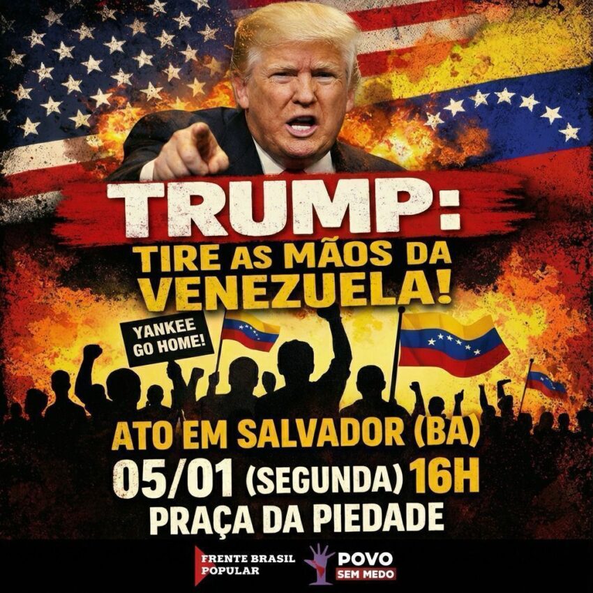Organizações ligadas à esquerda e a movimentos sociais convocaram um ato público em Salvador para protestar contra as ações dos Estados Unidos na Venezuela e em defesa da soberania do país sul-americano. A mobilização está marcada para a próxima segunda-feira (5), às 16h, na praça da Piedade, no centro da capital baiana.