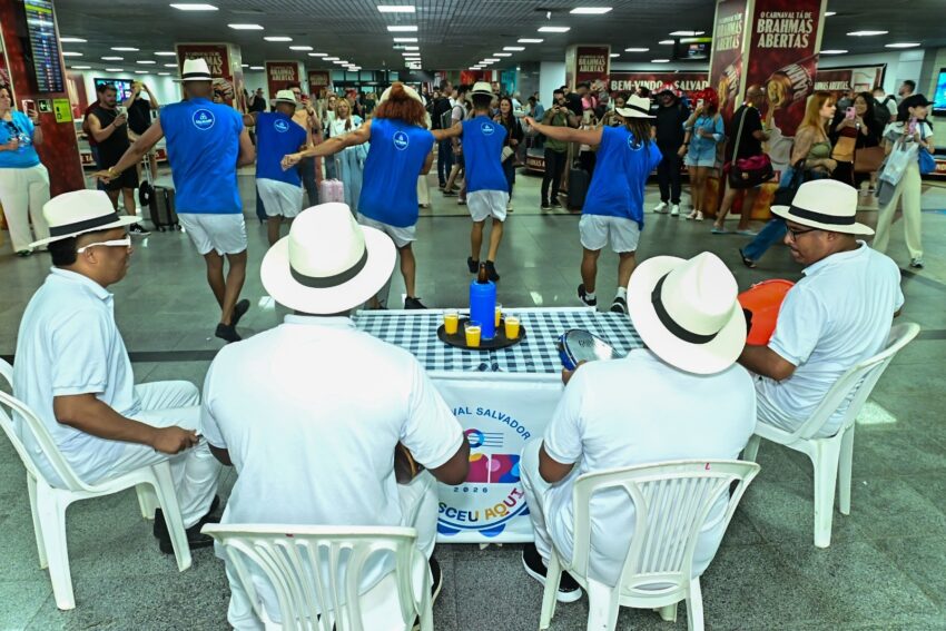 Apresentação – Com proposta cênica concebida para valorizar a identidade cultural da Bahia e surpreender quem desembarca na capital, o receptivo tem início com quatro sambistas posicionados em uma mesa no saguão, interpretando “Samba da Minha Terra”, de Dorival Caymmi.